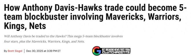 各取所需!结合市场中各队的需求,美媒《clutchpoints》晒出一笔潜在的5方15人大交易方案,通过这笔交易勇士迎回克莱,老鹰拿下浓眉。